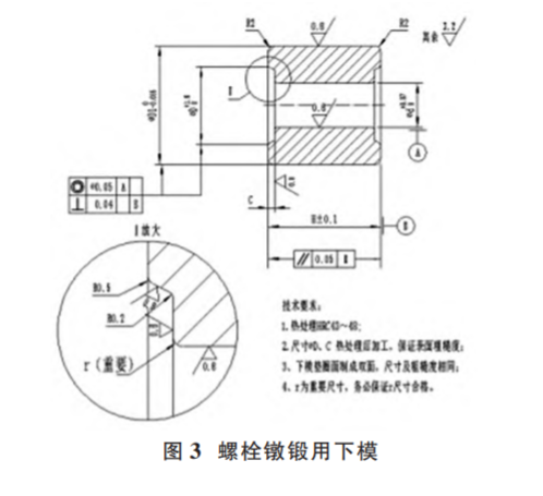 對應(yīng)于螺栓頭下圓弧 r,不論是冷鐓還是熱鍛,在螺栓實際生產(chǎn)過程中重點控制的應(yīng)該是螺栓鐓鍛用下模的 r,一是有意識加大 r 值,二是保證 r 圓弧過渡規(guī)范,而且 在模具加工過程中絕對不能出現(xiàn)扎刀現(xiàn)象(如圖 3)。