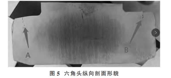 (2)原因分析。將該類問題螺栓六角頭縱向剖開,剖面如圖 5所示,在六角頭墊圈面邊沿的 A、B 處有明顯的裂紋,說明螺栓六角頭墊圈面邊沿存在應(yīng)力集中,在淬火時形成裂紋,這種裂紋最終將導(dǎo)致螺栓掉頭。