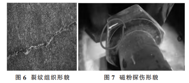 裂紋的金相組織形貌如圖6;磁粉探傷照片如圖 7,標識圈內(nèi)所示墊圈面邊沿有明顯的磁粉堆積。