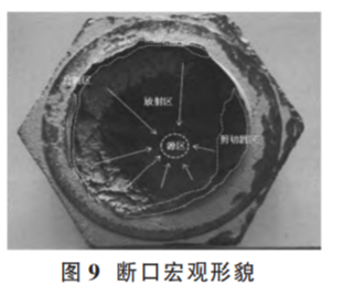 (2)原因分析。通過宏觀、金相、力學(xué)性能、斷口、能譜等綜合檢測分析,認為該案例失效原因是:螺栓加熱時未熱透,鍛造過程中變形抗力與變形速率不匹配,在六角頭芯部形成裂紋,且裂紋經(jīng)調(diào)質(zhì)處理和使用過程中進一步擴展,最終斷裂。斷口宏觀形貌如圖 9。
