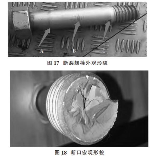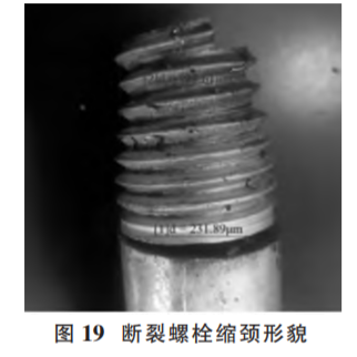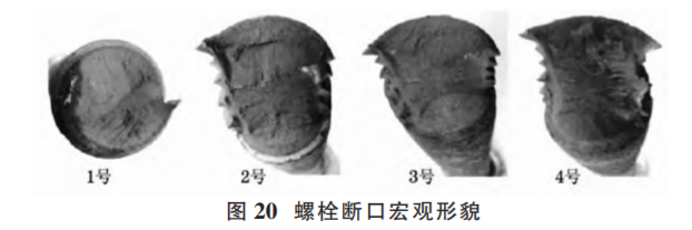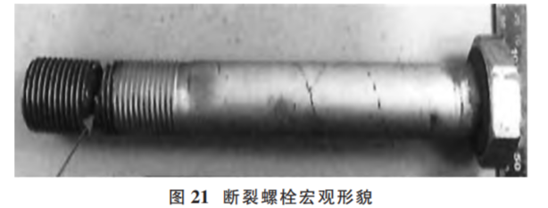(2)原因分析。現(xiàn)場勘察時發(fā)現(xiàn)有 4 顆螺栓的斷口上 存在與螺栓軸向大致垂直的斷裂面,為首斷裂件 (如圖 20);其他斷裂螺栓斷口均比較粗糙,存在明顯的彎曲變形和塑性變形特征,為后斷裂件。