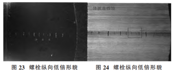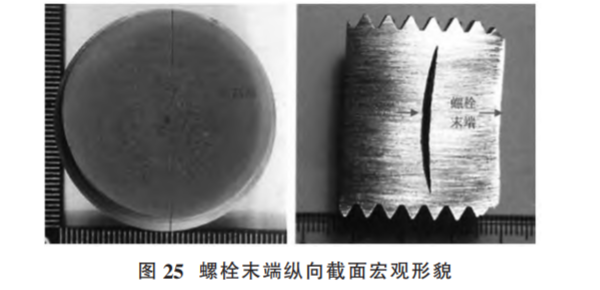 圖25為斷裂螺栓末端縱截面取樣位置及縱截面宏觀形 貌,可見在距離末端第 3 扣螺紋對應(yīng)位置內(nèi)部存在橫向裂紋。