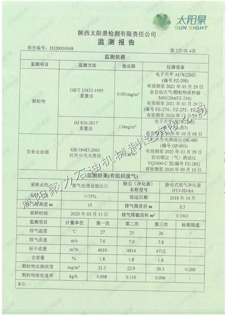 依據GB 9078-1996《工業爐窯大氣污染物排放標準》表2"熱處理爐二級”、GB 16297-1996《大氣污染物綜合排放標準》表2“無組織排放”及GB 18483-2001《飲食業油煙排放標準》表2的要求,本次監測結果符合要求。